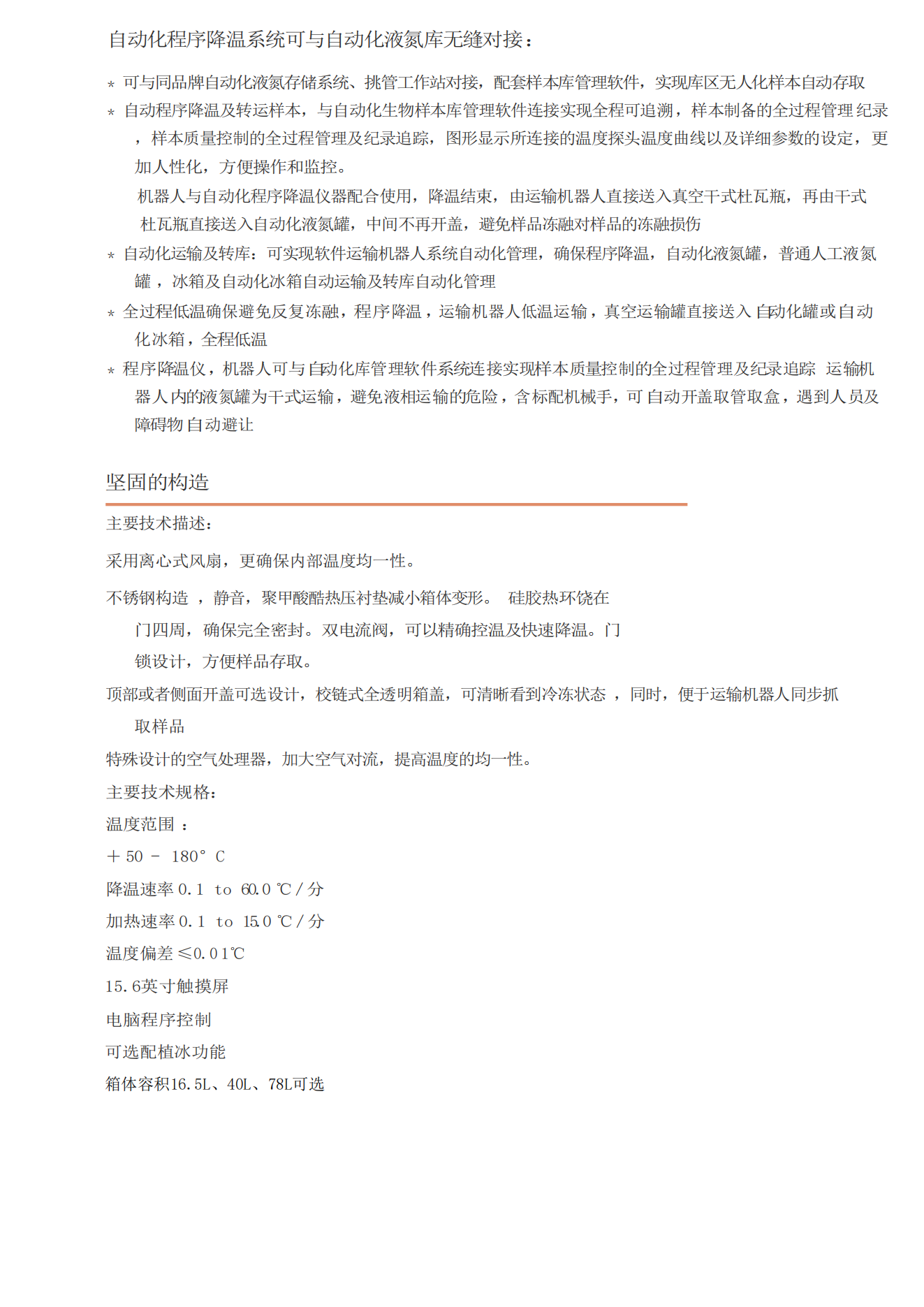 Cryomed程控降溫儀是一種高性能 ,安全可靠的溫變速率可調的冷凍系統,現已廣泛應用于輕工 、農、醫、基礎生物研究等各個領域中 ,用于淋巴細胞、組織庫、骨髓細胞、腫瘤細胞 ,動、植物細胞、心肌細胞等的凍存。全新設計的一體化 Cryomed系統采用了新的溫控技術和液氮分散技術 ,使程控降溫過程均一穩定 ,高效滿足GLP實驗室的需要。